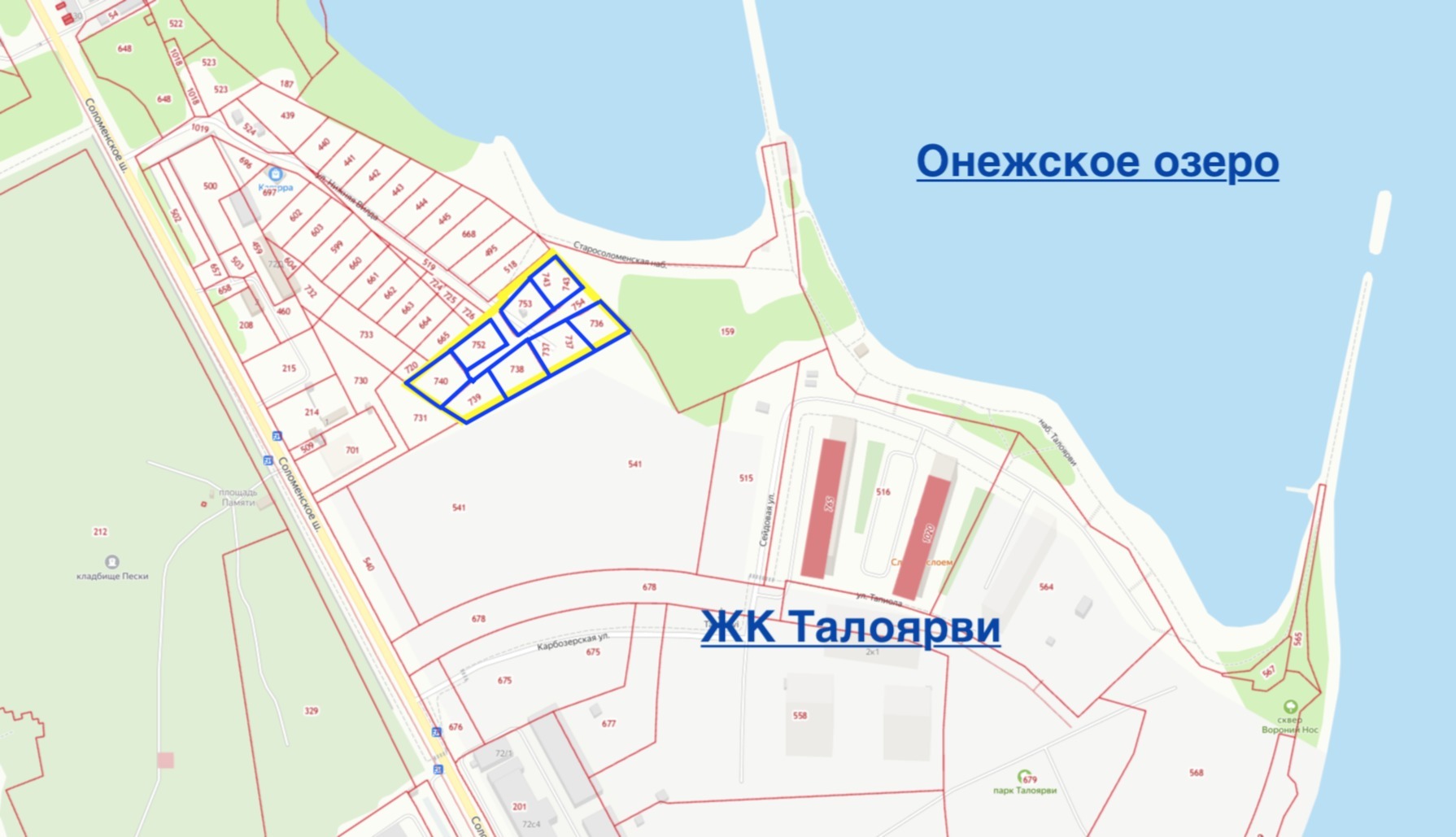Адрес объекта: г. Петрозаводск, в районе ЖК Talojarvi.Координаты объекта: 61°49.39'N, 34°18.53'EКадастровые номера участков: 10:01:0040101:736, :737, :738, :739, :740, :743, :752, :753, :754Категория земель: Земли населенных пунктов.ВРИ: Гостиничное обслуживание. Территориальная зона: зона Ор. Зона многофункциональной общественно-деловой застройки районного значения